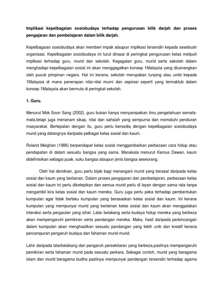 Implikasi Kepelbagaian Sosiobudaya Terhadap Pengurusan Bilik Darjah Dan Proses Pengajaran Dan Pembelajaran Dalam Bilik Darjah