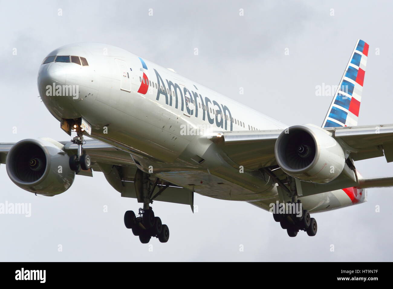 American Airlines Boeing 777 200 N756am Landung Am Flughafen London Heathrow Vereinigtes Konigreich Stockfotografie Alamy