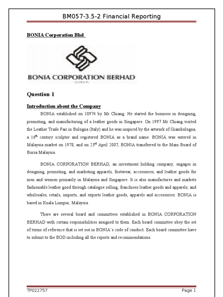 Assignment Financial Accounting Introduction Of Bonia Corporation Berhad Bonia Corporation Berhad Is A Public Listed Company In Malaysia Which Is Course Hero
