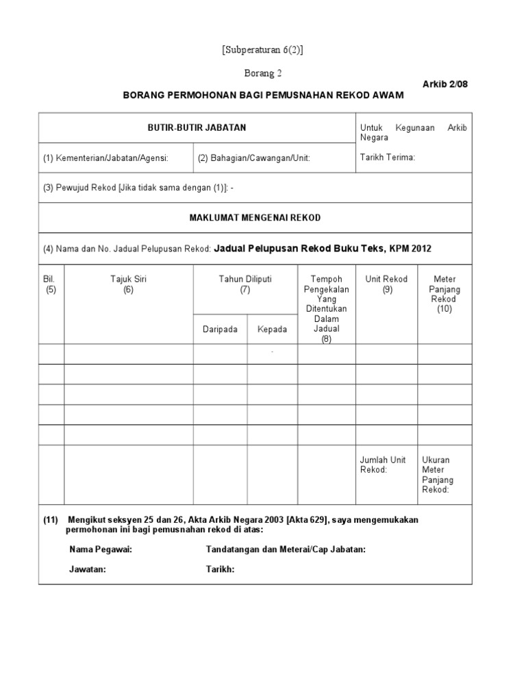 Subperaturan 6 2 Borang 2 Arkib 2 08 Borang Permohonan Bagi Pemusnahan Rekod Awam