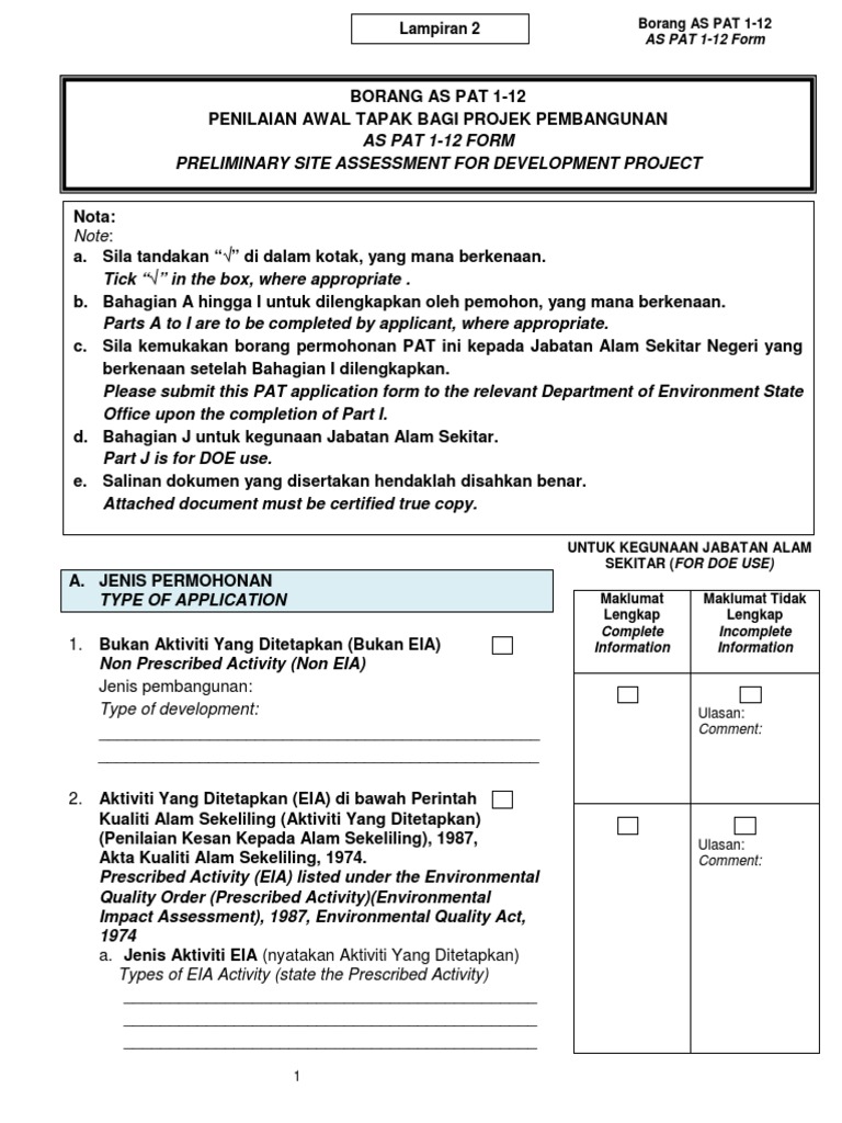 Borang Penapisan Awal Tapak Untuk Ssic Com My Borang As Pat 1 12 As Pat 1 12 Form A Jenis Permohonan Type Of Application 1 Bukan Aktiviti Yang Ditetapkan Bukan Eia