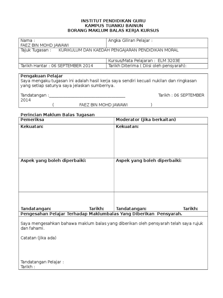 Doc Institut Pendidikan Guru Kampus Pulau Pinang Borang Maklum Balas Kerja Kursus Projek Amali Edup 3053 Academia Edu