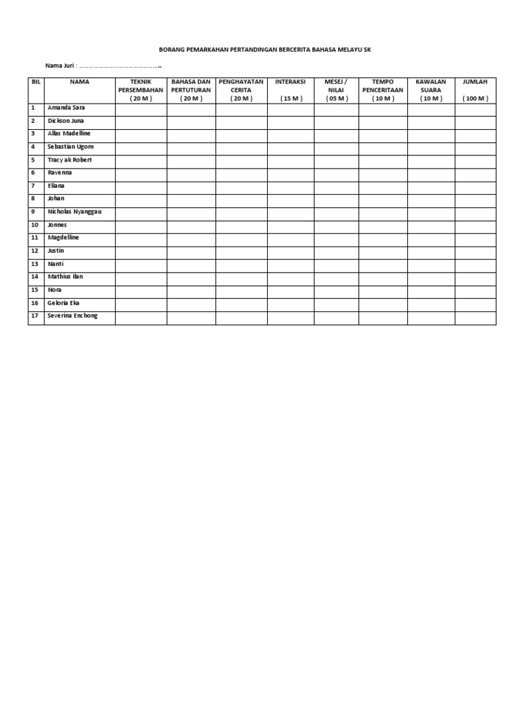 Bil nama teknik persembahan 20 m bahasa dan pertuturan 20 m penghayatan cerita 20 m interaksi 15 m mesej nilai 05 m tempo penceritaan 10 m kawalan suara 10 m jumlah 100 m. Borang pemarkahan pertandingan bercerita bahasa malaysia. Borang pemarkahan pertandingan bercerita.